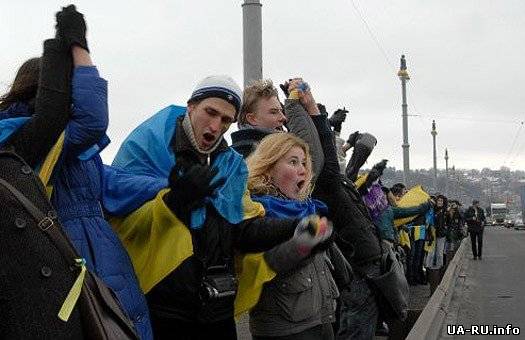 Национальной символикой активисты Евромайдана соединили правый и левый берега Украины, написали на