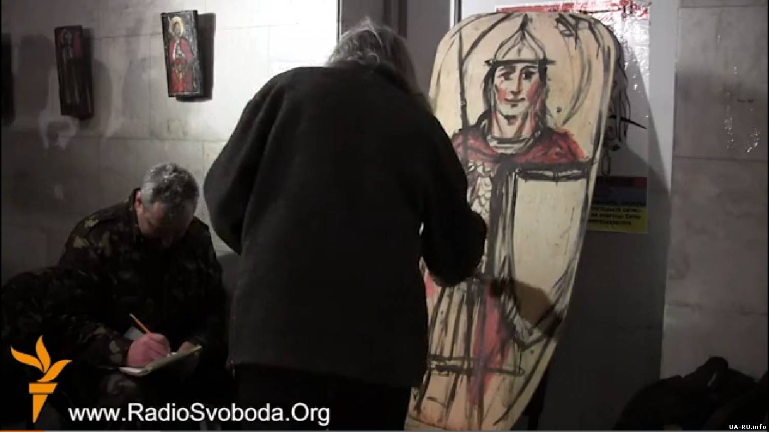 В Киеве в помещении Украинского дома художники разрисовали щиты участникам самообороны Евромайдана.