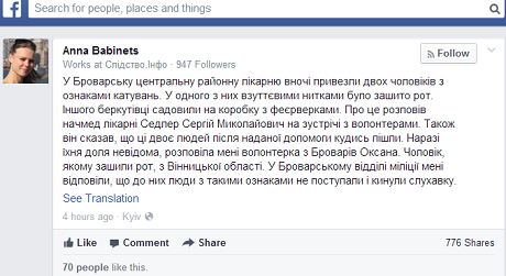Как сообщает журналистка Анна Бабинец, вчера в Броварскую центральную районную больницу привезли 2