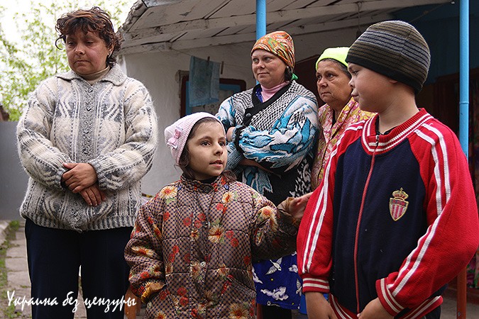 Выходим на пустынную улицу, идем вдоль дворов. Кажется, что хаты покинуты своими хозяевами. В огородах — никого. И все вокруг заросло тюльпанами. Вдруг, перед одним из домов встречаем шумное семейство. Трое женщин, двое детишек и неуемный голосистый щенок, во всю свою молодую, а поэтому пока визгливую глотку показывающий, кто здесь хозяин. Маленький Дима деловито докладывает нам, чем вооруженные силы Украины «радуют» жителей в преддверии праздника..