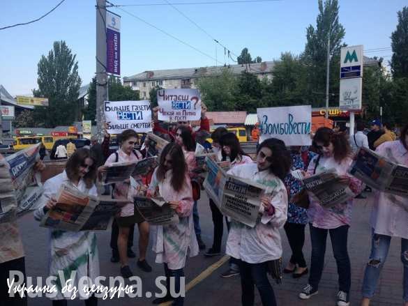 Представители «Видсичи» традиционно нарядились в костюмы зомби, изображая «зомбированных пропагандой», и окружили очередь за газетой. Далее Чепура так описывает настроения публики в самом центре Киева: