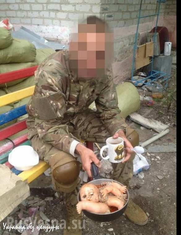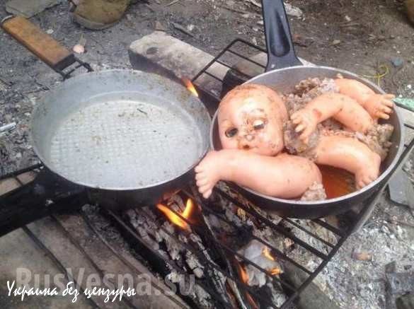 Латентный каннибализм от батальона «Азов»: боевики развлекаются «перфомансами», обжаривая расчлененного кукольного младенца -«москаля» на сковороде с гречневой кашей (ФОТО)