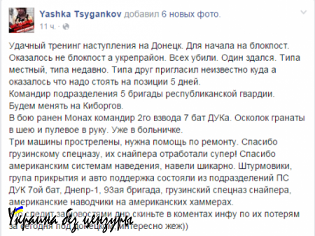 «Удачный тренинг наступления на Донецк. Для начала на блокпост. Оказалось не блокпост, а укрепрайон. Всех убили. Один сдался. Типа местный, типа недавно. Типа друг пригласил неизвестно куда, а оказалось, что надо стоять на позиции 5 дней.