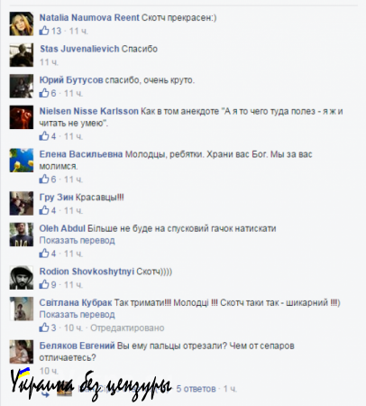 Любопытны комментарии «украинских патриотов» (см. скрин), например, этот: «Більше не буде на спусковий гачок натискати» или этот: «Надо было ампутировать по горло ему все….большой тоже надо было резать»