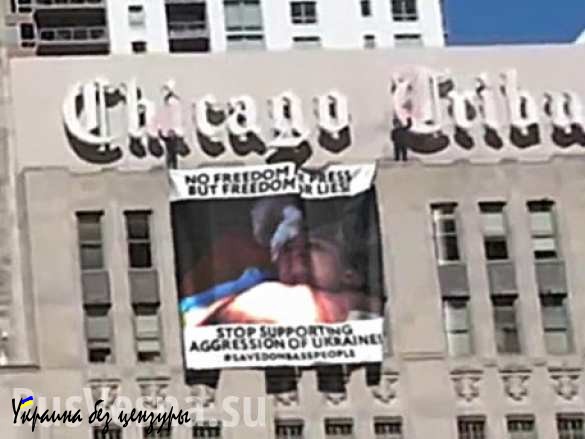 Неизвестные мужчины вывесили баннер со словами «Спасите жителей Донбасса» и «Прекратите поддержку агрессии Украины» на здании, в котором находятся офисы телеканала CNN, газеты The Chicago Tribuneи компаний Tribune Media и Tribune Publishing. Агитационный плакат развернули за считанные секунды.