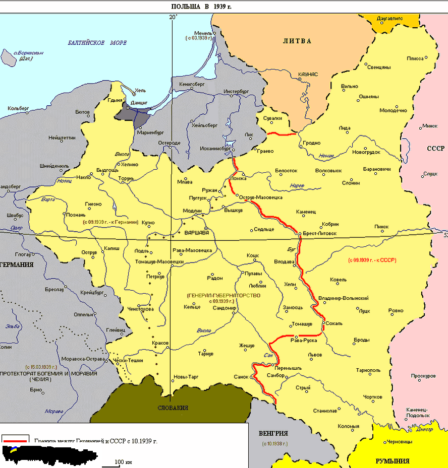 Мнение: Поляки еще даже не начинали в правовом отношении раскачивать Украину. Вся западноукраинская территория, отошедшая к УССР по итогам подписания пакта Молотова-Риббентропа, осужденного всем международным сообществом, в том числе и Россией, находится в подвешенном политико-правовом состоянии и может быть, при благоприятной для поляков геополитической ситуации, с полным на то основанием востребована назад. В Польше уже созданы общественные организации, намеренные в рамках действующих в Евросоюзе законов о реституции, требовать возвращения незаконно отторгнутого у поляков в период второй мировой войны имущества. Во Львове, например, до войны свыше 70% населения было польским, а практически все остальное не украинским, а еврейским. На карте – границы Польши по состоянию на 1 сентября 1939 года:
