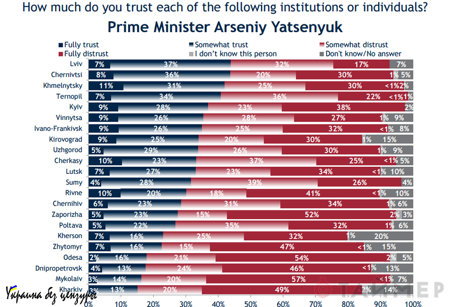 9. По данным исследования, проведённого Международным республиканским институтом правительства Канады, лишь 2% жителей города Одессы доверяю правительству премьер-министра Украины Арсения Яценюка. Данное социологическое исследование проводилось во всех городах Украины. Наиболее высокие показатели поддержки главы кабмина, которые, впрочем, не превышают отметку 11%, в центральной и западной частях Украины.