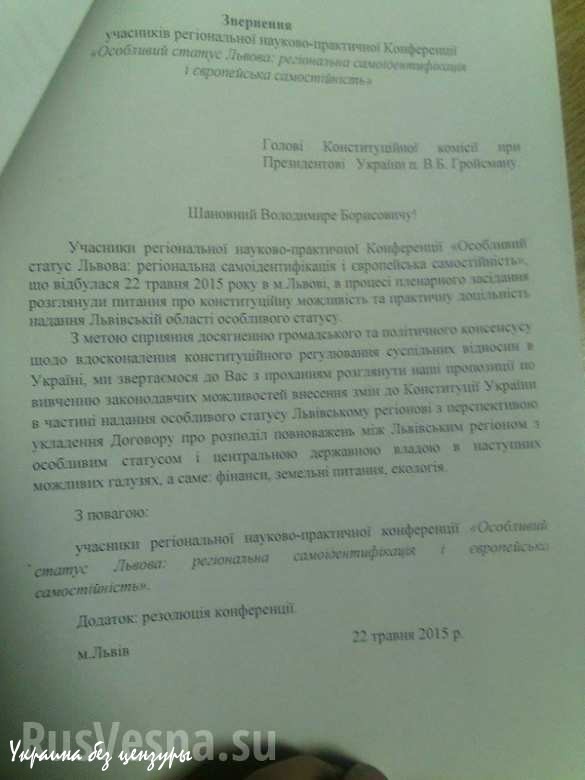 «В целях содействия достижению общественного и политического консенсуса по совершенствованию конституционного регулирования общественных отношений на Украине, рекомендуется рассмотреть предложения по изучению законодательных возможностей внесения изменений в Конституцию Украины в части предоставления особого статуса Львовском региону с перспективой заключения Договора о разделе полномочий между Львовским регионом с особым статусом и центральной государственной властью в следующих возможных областях, а именно: финансы, земельные вопросы, экология», — передает «Комсомольская правда».