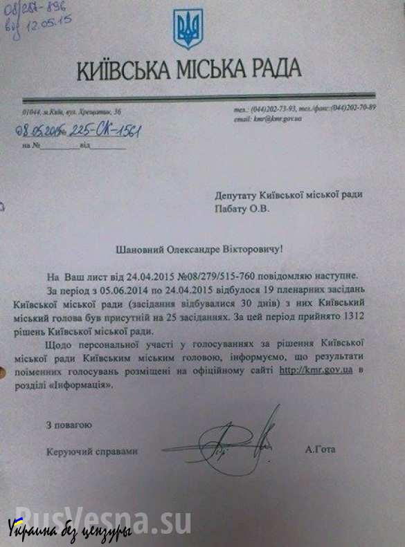 «За период с 05.06. по 24.04. состоялось 19 пленарных заседаний Киевского горсовета (заседания проходили 30 дней) из них Киевский городской председатель присутствовал на 25 заседаниях», — говорится в тексте ответа.