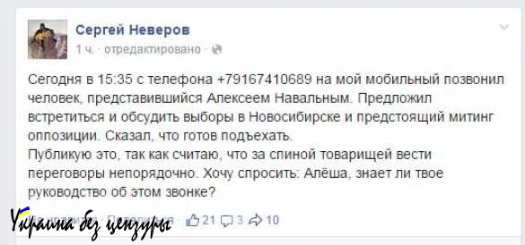 «Сегодня в 15:35 с телефона +79167410689 на мой мобильный позвонил человек, представившийся Алексеем Навальным. Предложил встретиться и обсудить выборы в Новосибирске и предстоящий митинг оппозиции. Сказал, что готов подъехать.