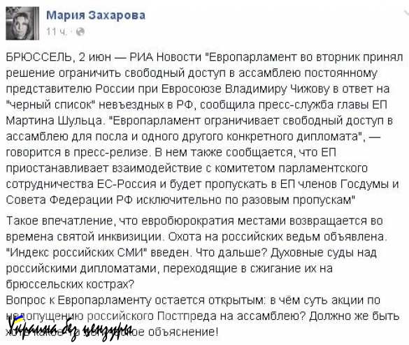 В свою очередь, замдиректора департамента информации и печати МИД РФ Мария Захарова на своей странице в Facebook назвала такое решение «охотой на российских ведьм».