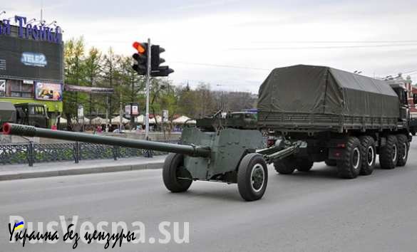 На параде присутствовали три грузовика-тягача, буксировавшие артиллерийские установки. Стоит отметить, что присутствовали запрещенные минскими соглашениями установки — противотанковая пушка 100 мм 2A29 «Рапира» и две 122-мм гаубицы D30.