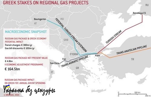 Совершенно точно, что в контексте перманентного бейлаута, Европа запретит прохождение по территории Греции любых русских газопроводов, ожидая успеха сирийской операции и того, что катарский газопровод вытеснит Газпром с позиций основного энергетического поставщика Европы.