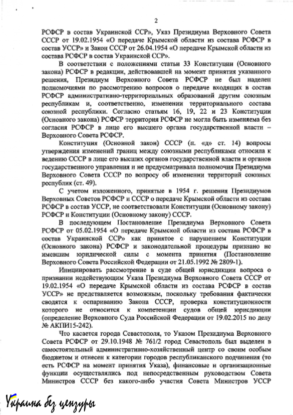 По его словам, подобные вопросы не могли быть решены без участия Верховного Совета РСФСР как высшего органа государственной власти республики. А значит, что принятые в 1954 году решения Президиумов Верховных Советов РСФСР и СССР о передаче Крымской области из состава РСФСР в состав УССР, не соответствовали ни Конституции РСФСР, ни Конституции СССР.