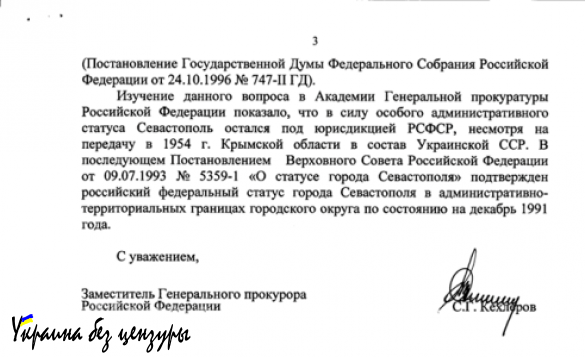 «В документе за подписью заместителя Генпрокурора С. Кехлерова говорится, что Президиум Верховного совета РСФСР не имел полномочий передавать область другой союзной республике и изменять тем самым территорию и границы Российской Федерации», — написал Миронов.
