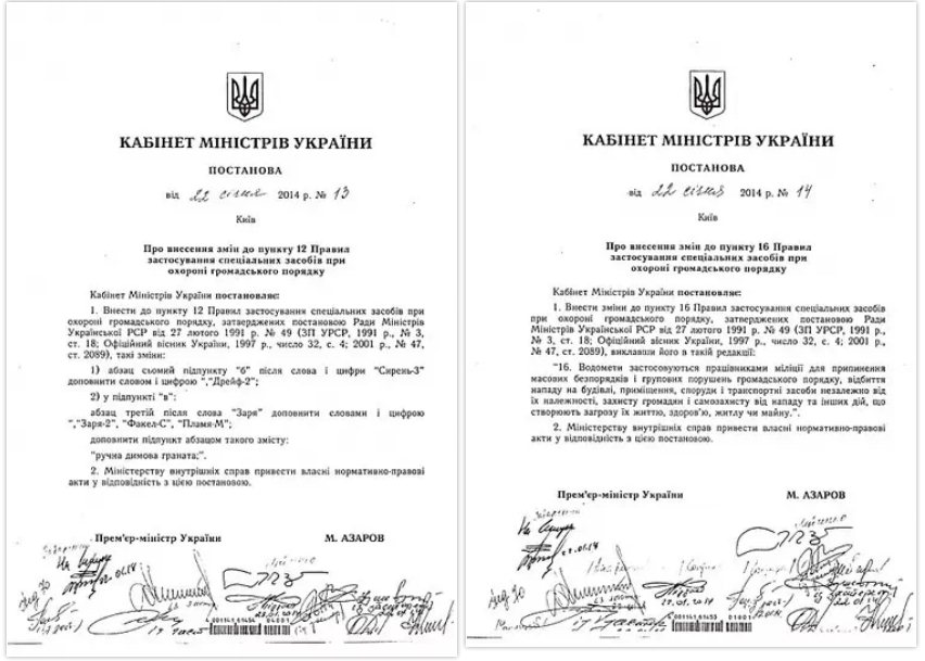 Отдельно Москаль отмечает, что Кабинетом министров Украины 22 января этого года также было принято постановление №14 от 22.01.14 года «О внесении изменений в пункт 16 Правил применения специальных средств при охране общественного порядка», согласно которой фактически разрешено применение водометов при температуре ниже 0 градусов по Цельсию. По имеющейся информации, указанное постановление было принято с аналогичными нарушениями, без согласования заинтересованных министерств и обнародована без подписи Азарова.