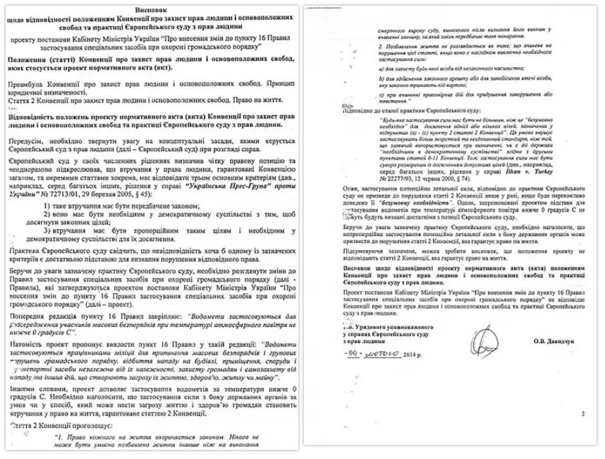 Более того, 4 февраля текущего года исполняющий обязанности Правительственного уполномоченного по делам Европейского суда по правам человека Давидчук А.В. подписал заключение, что проект постановления Кабмина «О внесении изменений в пункт 16 Правил применения специальных средств при охране общественного порядка» не соответствует Конвенции о защите прав человека и основных свобод и практике Европейского суда по правам человека, подчеркнул Москаль.