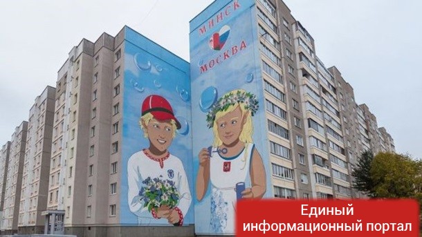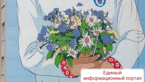 Неизвестные художники дорисовали колючую проволоку на огромном граффити в столице Беларуси, призванном символизировать дружбу между Минском и Москвой. На рисунке изображены мальчик и девочка в одеждах, украшенных гербами Москвы и Минска.