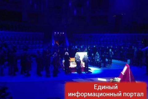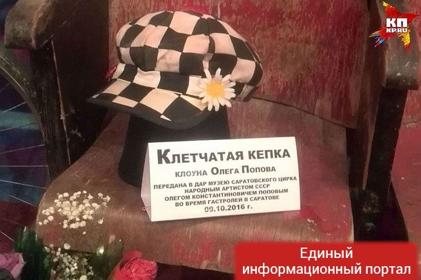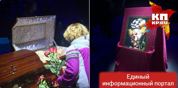Гроб с телом артиста, одетым в сценический костюм клоуна, установлен на арене ростовского цирка. На экране показывают записи выступлений Попова.