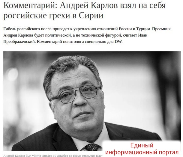 Русскоязычная редакция Deutsche Welle опубликовало комментарий политолога с заголовком "Андрей Карлов взял на себя российские грехи в Сирии".