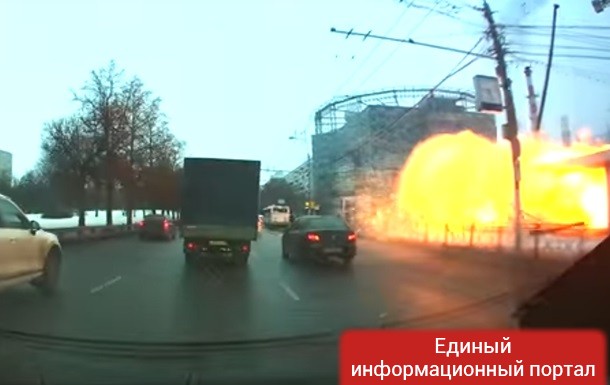 На видео видно, как взрыв выносит стекла, осыпая обломками проезжающие автомобили. Сразу после этого в вестибюле начался пожар.