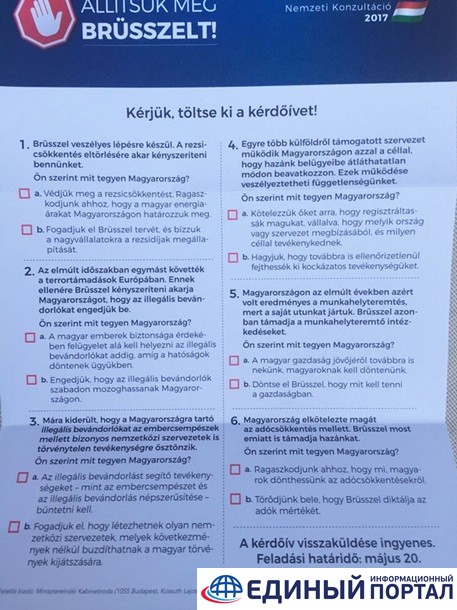 В анкете под заголовком "Остановим Брюссель", которую чиновники разослали во все домашние хозяйства, власть спрашивает граждан, как должна отнестись к политике ЕС. Опросник состоит из шести вопросов, касающихся отношения венгров к миграционной и экономической политике Евросоюза.