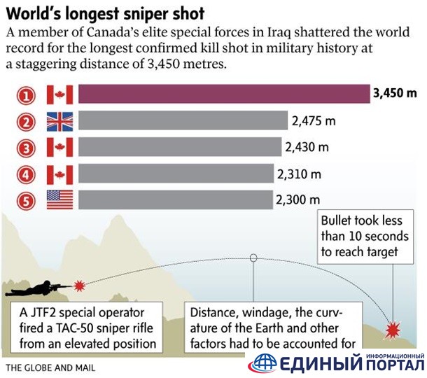 "Это невероятное мастерство. Это мировой рекорд, который, возможно, никогда больше не будет побит", – цитирует издание свой источник в канадских вооруженных силах. Он также подчеркнул, что смерть боевика была зафиксирована камерой из другой точки наблюдения, подчеркнув, что это "не мнение и не предположение".