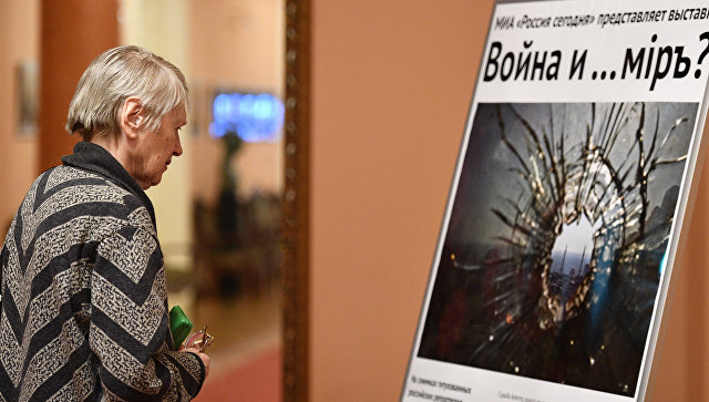 Посетитель на открытии фотовыставки Война и… мiръ? в фойе Зимина Московского музыкального театра Геликон-опера