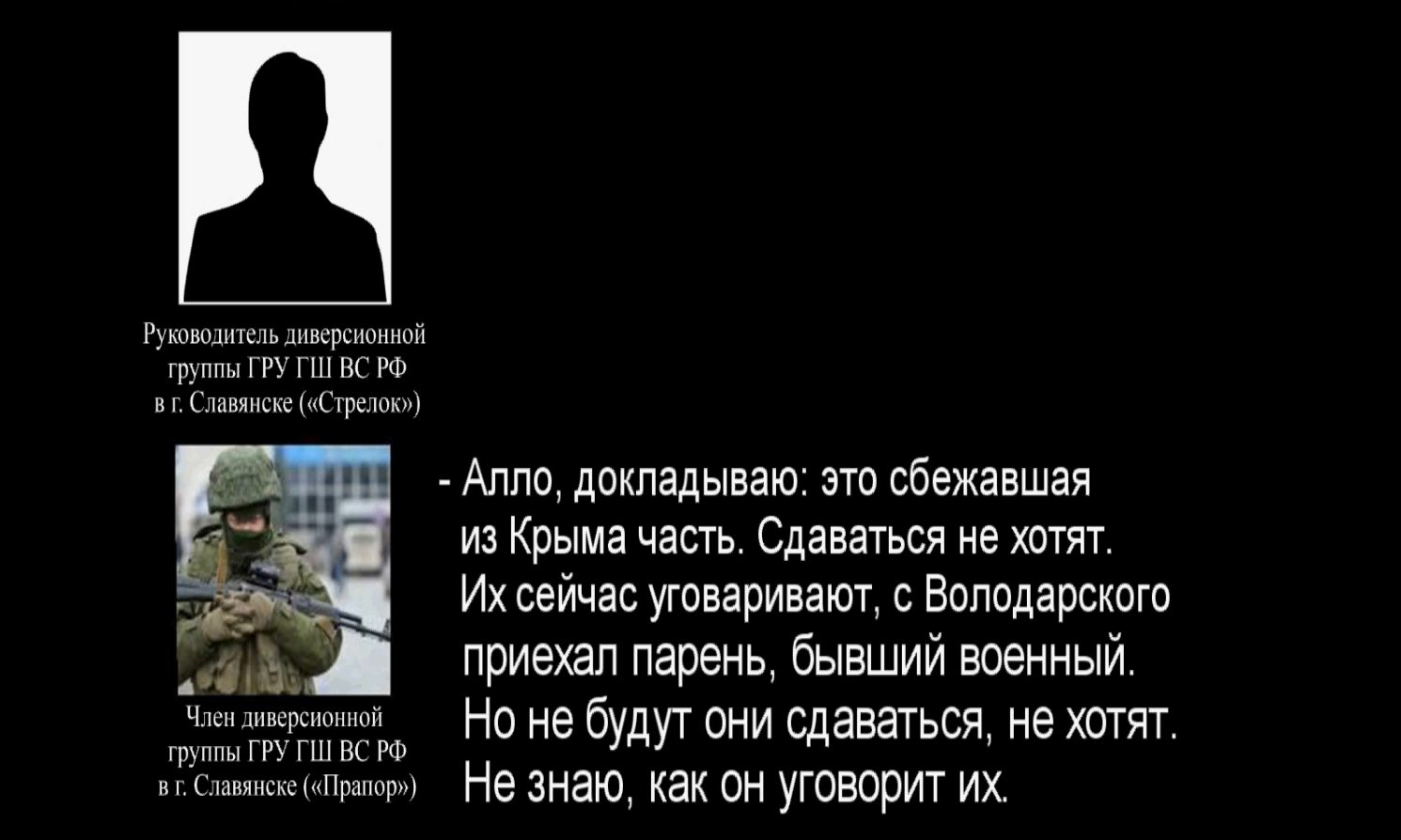 Член диверсионной группы сообщает, что в Славянске воинская часть ВС Украины, которая прибыла из Крыма, не хочет сдаваться. Уговоры не действуют. Тогда "Стрелец" предлагает класть украинских военных на землю под угрозой, блокировать их до огня на поражение и разоружить. Однако советует дождаться еще кого-то по кличке "Ромашка" и объяснить украинским военным, что они не в Крыму и церемониться с ними не будут.