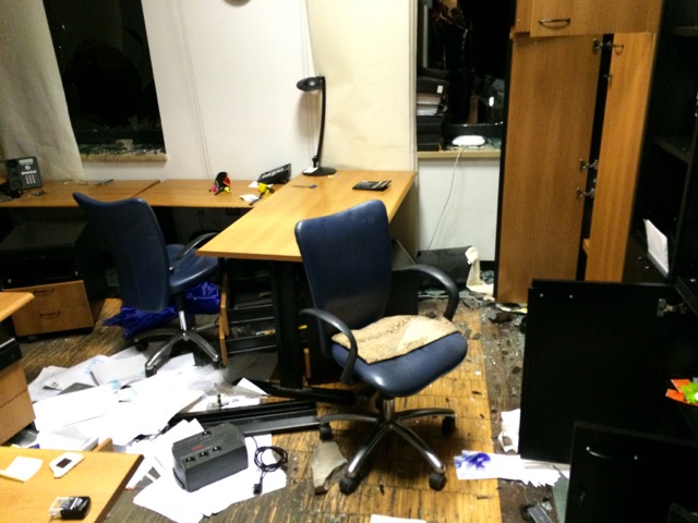 Вчера террористы с особой злостью громили офис ИСД (Индустриального Соза Донбасса). В офисе было растрощено все: компьютеры, мебель, окна. По мнению террористов особо ценными оказались... алкоголь и иконы, которые они вынесли из здания.