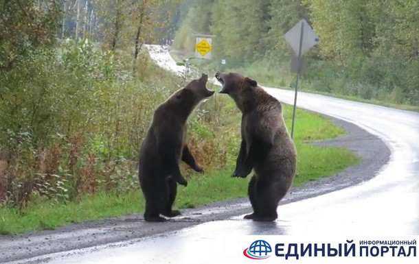 В канадской провинции Британская Колумбия сняли на видео двух сражающихся на шоссе медведей гризли. На кадрах, снятых канадкой Кари МакГилливрей, видно, как звери сначала грозно рычат друг на друга, а затем встают на задние лапы и начинают сражаться.