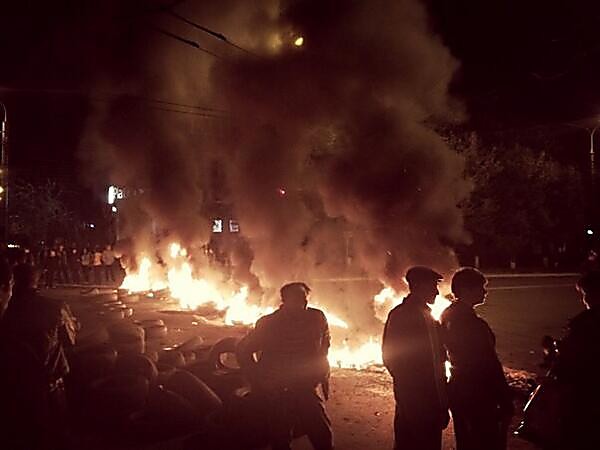 Кроме того сообщается, что на дорогах жгут шины. В самом городе звучит сирена.