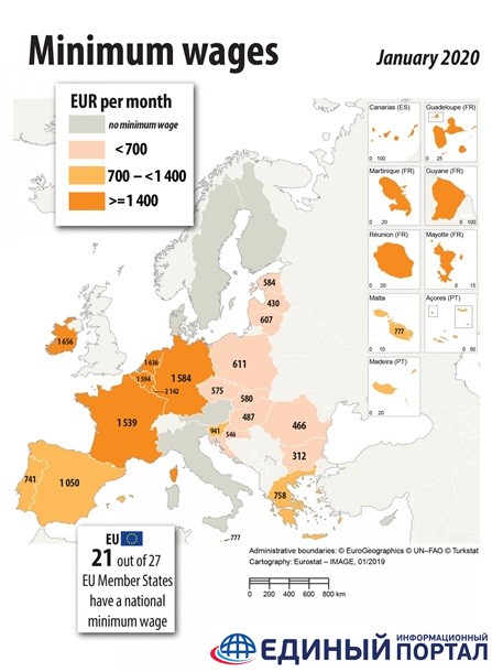 Самая высокая минимальная зарплата установлена в странах, расположенных на западе и севере ЕС - более 1500 евро в месяц.
