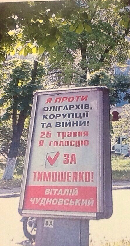 На ситилайтах Чудновский призывает голосовать за Юлию Тимошенко на выборах Президента Украины.