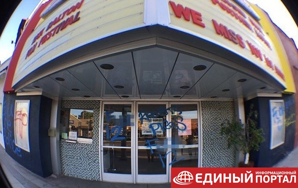 Издание пишет, что во время протестов, вандалы исписали стены кинотеатра нецензурными ругательствами в отношении полицейских.