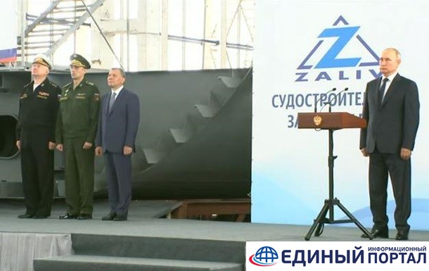 "Сегодня на трех ведущих верфях России одновременно закладываются шесть новых кораблей дальней морской зоны. Здесь в Керчи это два универсальных десантных корабля, в Санкт-Петербурге на заводе Северная верфь - два фрегата, а Северодвинске на Севмашпредприятии - два атомных подводных крейсера", - сказал президент РФ.
