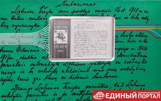 У монеты также есть физический аналог из серебра весом 36,36 грамма. Он посвящен членам Литовской Тарибы - двадцати общественным деятелям, которые 16 февраля 1918 года подписали Акт о независимости Литвы.