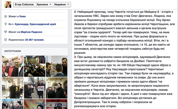 «Найкращий приклад, чому Чернігів готується до Майдану-3 - історія з начальником УВС. Зараз ним знову став Олег Демченко. Людина, яка служила Януковичу на посаді очільника Харківської міліції. Яку Арсен Аваков в березні спробував зробити керівником міліції Чернігівщини, але після протестів громадськості взагалі звільнив з органів внутрішніх справ "за станом здоров'я".Тепер цей пан повернувся. Чому, на яких підставах - людям ніхто нічого не пояснює. При цьому формально в області оголошений конкурс з підбору начальника міліції. Втім, як і в інших 7 областях, де конкурс зараз оголошено, і в 10, де він навіть не починався, міністерство вже четвертий тиждень саботує будь-які рішення.