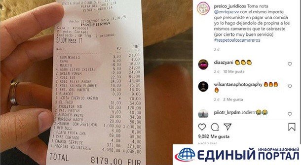 Как рассказал Кастаньеда, увидев пост, у него возникло желание посетить ресторан. Он пришел туда 22 августа в компании шести человек. После ужина предприниматель попросил включить в счет чаевые на сумму 4098 евро, заплатив в итоге 8179 евро.