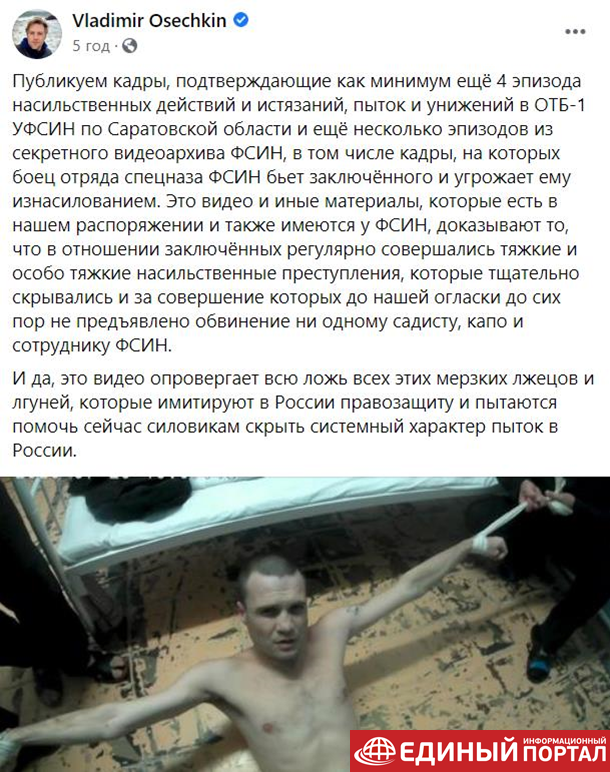 "Публикуем кадры, подтверждающие как минимум еще 4 эпизода насильственных действий и истязаний, пыток и унижений в ОТБ-1 УФСИН по Саратовской области и еще несколько эпизодов из секретного видеоархива ФСИН, в том числе кадры, на которых боец отряда спецназа ФСИН бьет заключенного и угрожает ему изнасилованием", - написал основатель Gulagu.net Владимир Осечкин в Facebook.