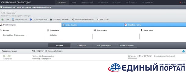 Россиянин Иван Хохлов 3 ноября подал иск в Арбитражный суд Орловской области с требованием взыскать миллиард долларов с американской рок-группы Metallica. Информация об этом появилась в картотеке арбитражных дел.
