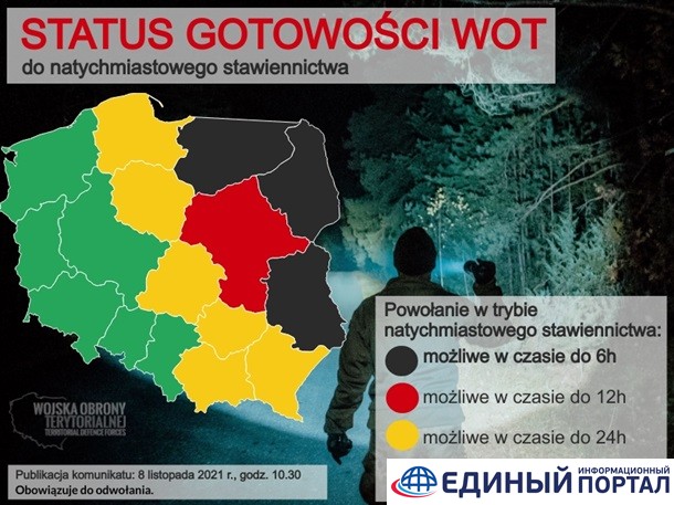 В связи со скоплением мигрантов Силы территориальной обороны Польши объявили тревогу, сказано в их Twitter. Теперь могут быть вызваны территориальные единицы, чтобы немедленно появиться и поддержать пограничную службу.