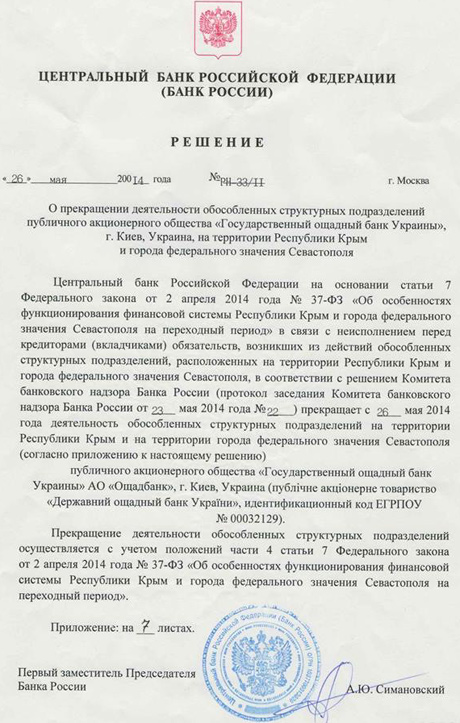 "Учора пізно ввечері у своїй службовій пошті натрапив на «лист щастя» від Центрального банку Росії за підписом першого зама Симановського. У ньому йшлося про рішення російського центробанку припинити роботу відділень українського Ощадбанку в Криму з 26 травня. Це при тому, що в зв’язку з російською окупацією та рейдерськими захопленнями відділень Ощадбанк вимушено припинив свою роботу на півострові ще три тижні тому – з 6 травня. А 8 травня прийняв рішення про закриття філійної мережі на час російської окупації АР Крим. При цьому хочу зазначити, що ми виконували всі свої зобов’язання перед клієнтами до останнього дня роботи.