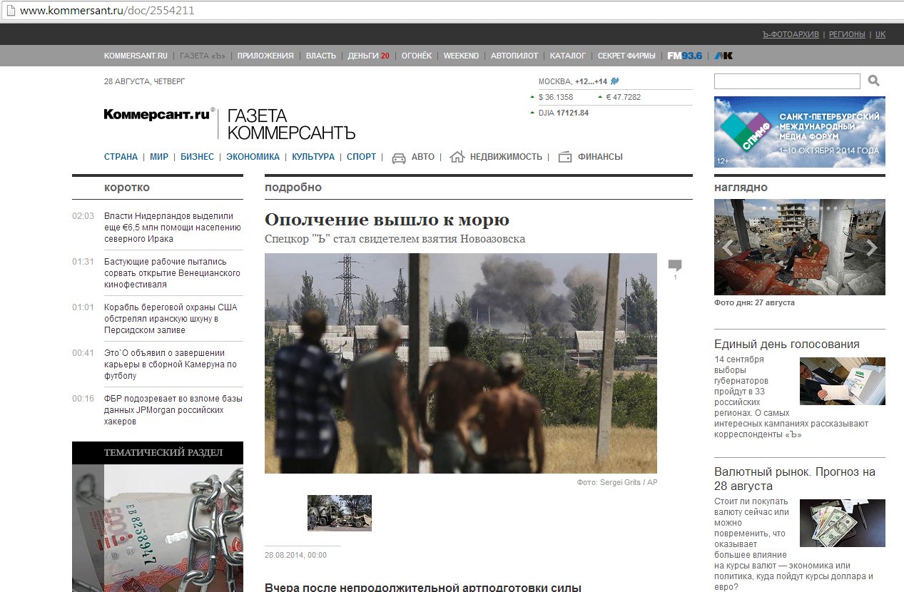 Сегодня российские войска вторглись в украинский город Новоазовск. В то время как многочисленные очевидцы, украинские военные, разведки НАТО и США напрямую говорят о российских войсках и огромных колоннах техники (как минимум известно о дух колоннах в 60 и 32 единицы техники) с закрашенными белой краской опознавательными знаками, Российская пресса на утро уже рапортует о победах "Ополчения", которая само с помощью техники купленной в магазинах отвоевало город. Первым отметилось издание "Коммерсант", принадлежащее Алишеру Усманову, которое в последние время из независимого издания превратилось в подстилку Кремля.
