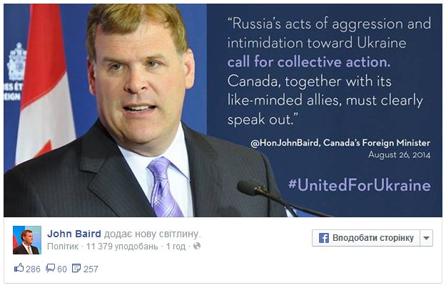 Об этом на своей странице в Facebook написал министр иностранных дел Канады Джон Бэрд.