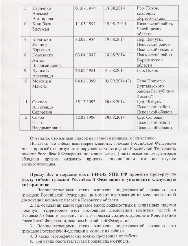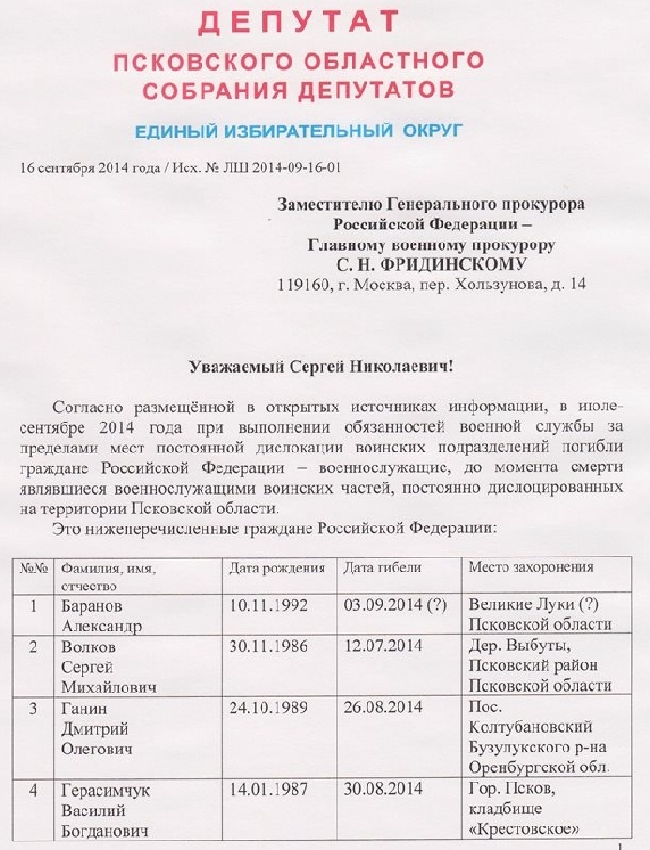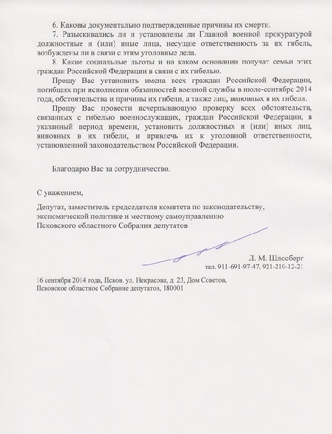 Депутат Псковского областного собрания депутатов Лев Шлосберг направил заместителю генерального прокурора РФ, главному военному прокурору С.Н. Фридинскому список из 12 российских военнослужащих, которые погибли в июле-сентябре 2014 года при выполнении обязанностей военной службы за пределами мет постоянной дислокации. Свое обращение депутат обнародовал в блоге в Livejournal.