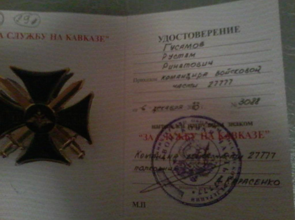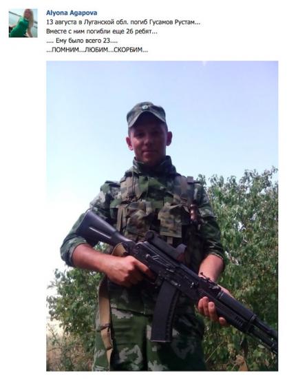 «Рустам Гусамов, 23 года, из Новосибирска. Срочную службу проходил в 2009-2010 годах в морской пехоте Северного флота, в/ч 15010, в Заозерске. После окончания срочной службы устроился по контракту в в/ч 27777 в с.Ханкала, Чечня», - пишет он об еще одном погибшем в Украине солдате.