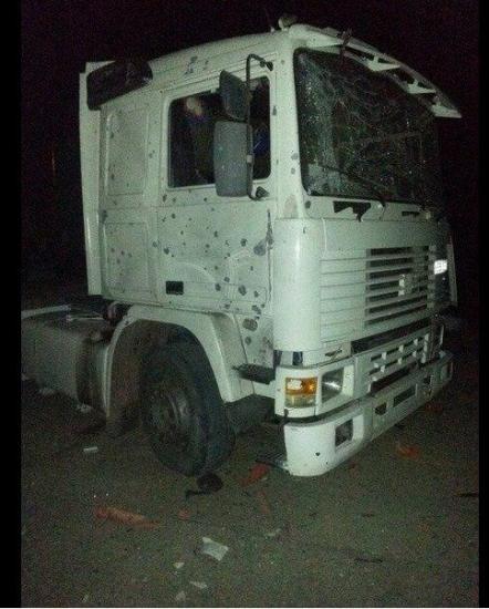 Тогда еще писали, что там взорвался какой-то цех взрывчатых веществ. Не знаю какой там взорвался цех, но по самым скромным подсчетам там осталось около 45-50 КАМАЗов "гуманитарного троянского конвоя". Территория завода с последствиями взрыва сейчас оцеплена боевиками и людей туда не пускают, но нам прислали фото одной из самых крайних машин, посеченной взрывом и расположенной близко к территории оцепления. Доподлинно неизвестно, что именно привело к такой мощной детонации "гречки и сахара", которой видимо под завязку были загружены белые путинские фуры. Возможно, кто-то из боевиков курил в неположенном месте или решил пострелять по бутылкам из под "гуманитарной путинки", но факт остается фактом.