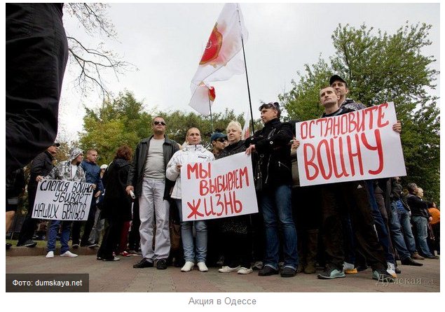 По информации "Думской", в Одессе на акцию пришло несколько сот человек с белыми флагами с гербом Одессы и плакатами "2 мая - народная трагедия", "Нет войне", "Слепая война убивает наших братьев". Планировался марш от Соборной площади к Куликовому полю, но все ограничилось обычным митингом.