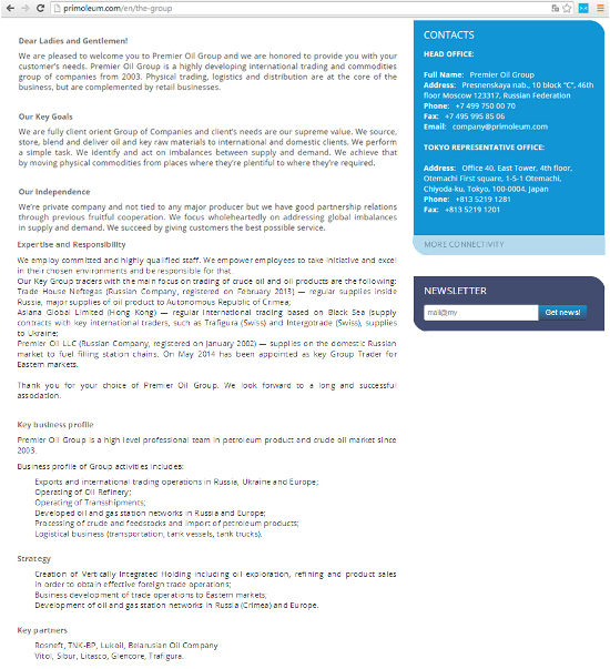 На сайте Premier Oil Group называлась «международной динамично развивающейся группой компаний в области трейдинга и сырьевых товаров», работающей с 2003 года. Основными направлениями ее бизнеса были указаны физическая торговля сырьем, логистика и дистрибуция, а также ретейл.